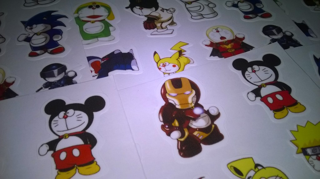 Dalam 1lembar stiker terdapat lebih dari 15stiker kecil yang sudah dipotong sesuai pola. Ukuran stiker kecil antara 3 – 5 cm.